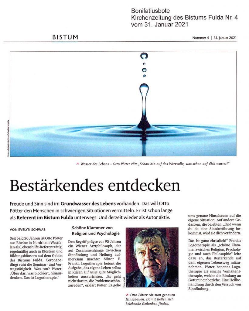 Als psychologischer Lebensberater (Jahrg. 1948) mit dem Schwerpunkt der Logotherapie nach Viktor E. Frankl (sinnzentrierte Persönlichkeitsentwicklung) bin ich seit Jahrzehnten bundesweit mit Vorträgen und Seminaren in der Erwachsenenbildung tätig, hauptsächlich in Klöstern, geistlichen Zentren und öffentlichen Bildungseinrichtungen. Otto Pötter auf Wikipedia.org